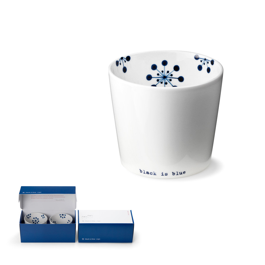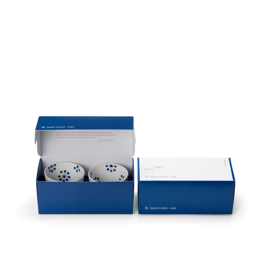 Porcelanowy, biało-niebieski, ręcznie zdobiony komplet kubków, z serii Black is Blue od Anne Black. Przez swój delikatny wzór nada klasy i uroku każdemu stołowi, polecamy każdemu kto gustuje w dobrym designie.