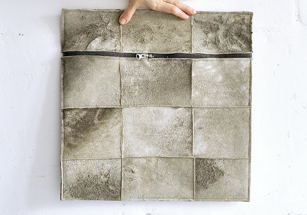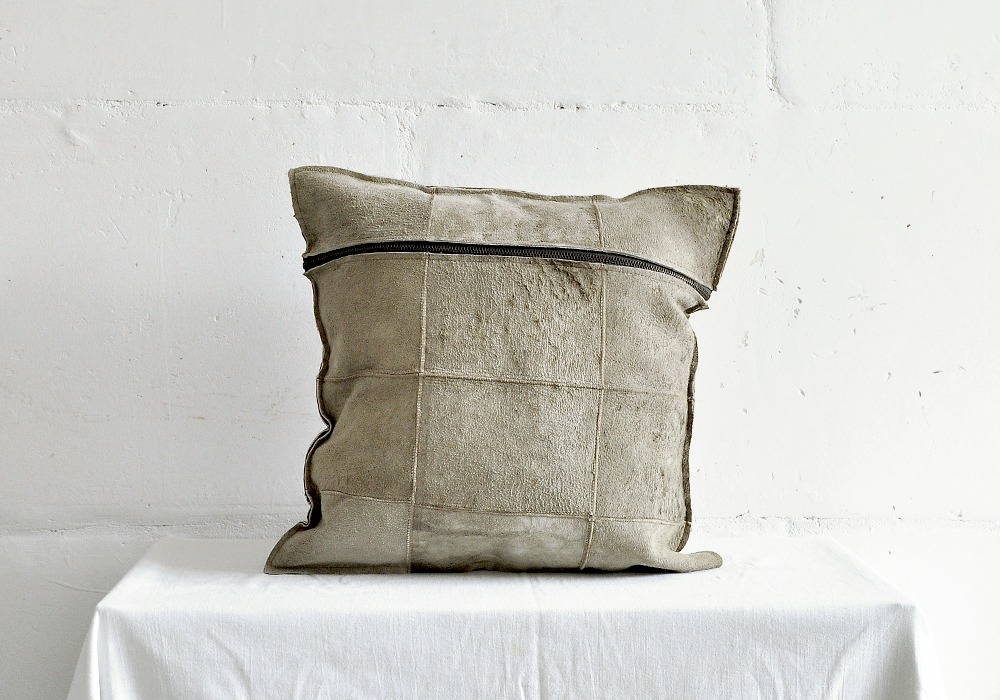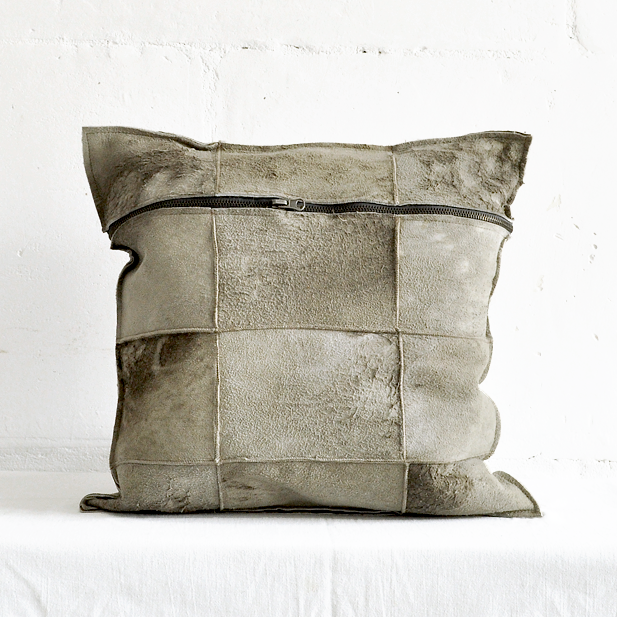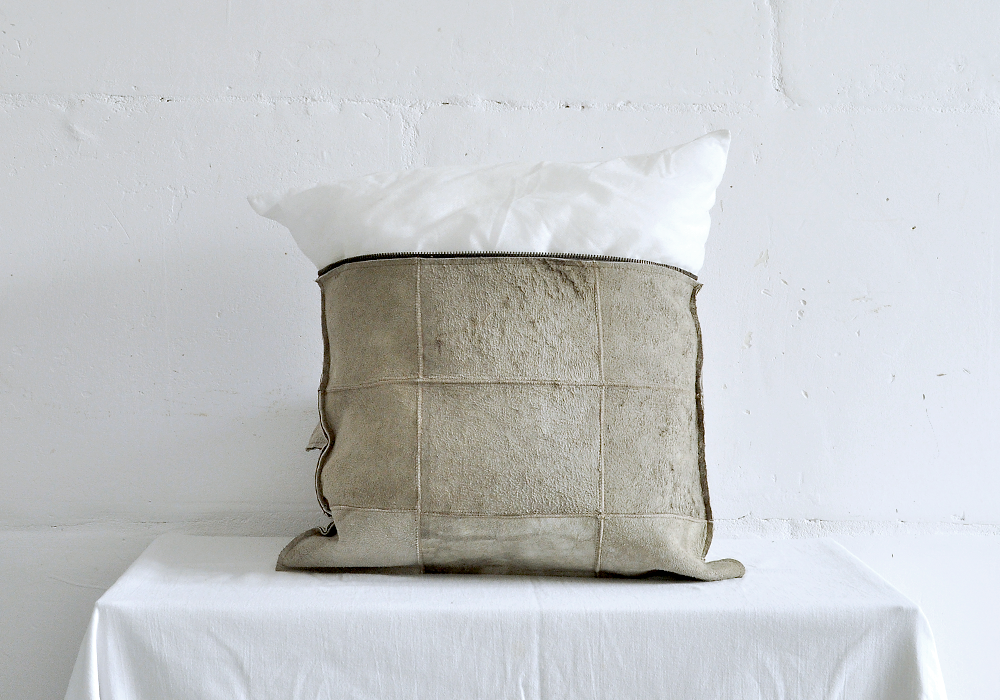 Poszewka dwuczęściowa uszyta jest z pięknie „zniszczonych” kawałków skóry owczej.